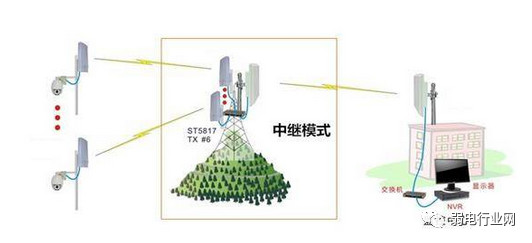 雙模/多模單無線網橋中繼,采用了一臺雙模或多模的無線網橋作為中繼點,通過兩面或多面的天線對準各個方向監控點的無線網橋作為接收端,對準監控中心無線網橋的天線則作為發射端。利用雙模或多模的優勢,就可以省去多臺無線網橋的費用,而且無需采用功分器或交換機,安裝更簡便。這類中繼方式,多用于傳輸距離較遠、傳輸帶寬要求較高、避開遮擋物、多中繼點等類型的監控工程或組件MESH網絡之中,缺點是這類設備的價格較高,但相對的性能更強。